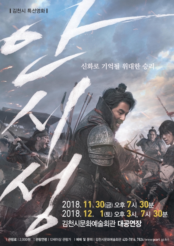| 김천시문화예술회관(관장 김금숙)에서는 시민들의 건전한 여가문화 활성화를 위하여 특선영화 <안시성>을 오는 11월 30일 오후 7시 30분, 12월 1일 오후 3시, 7시 30분 3회에 걸쳐 김천시문화예술회관 대공연장에서 상영한다.
