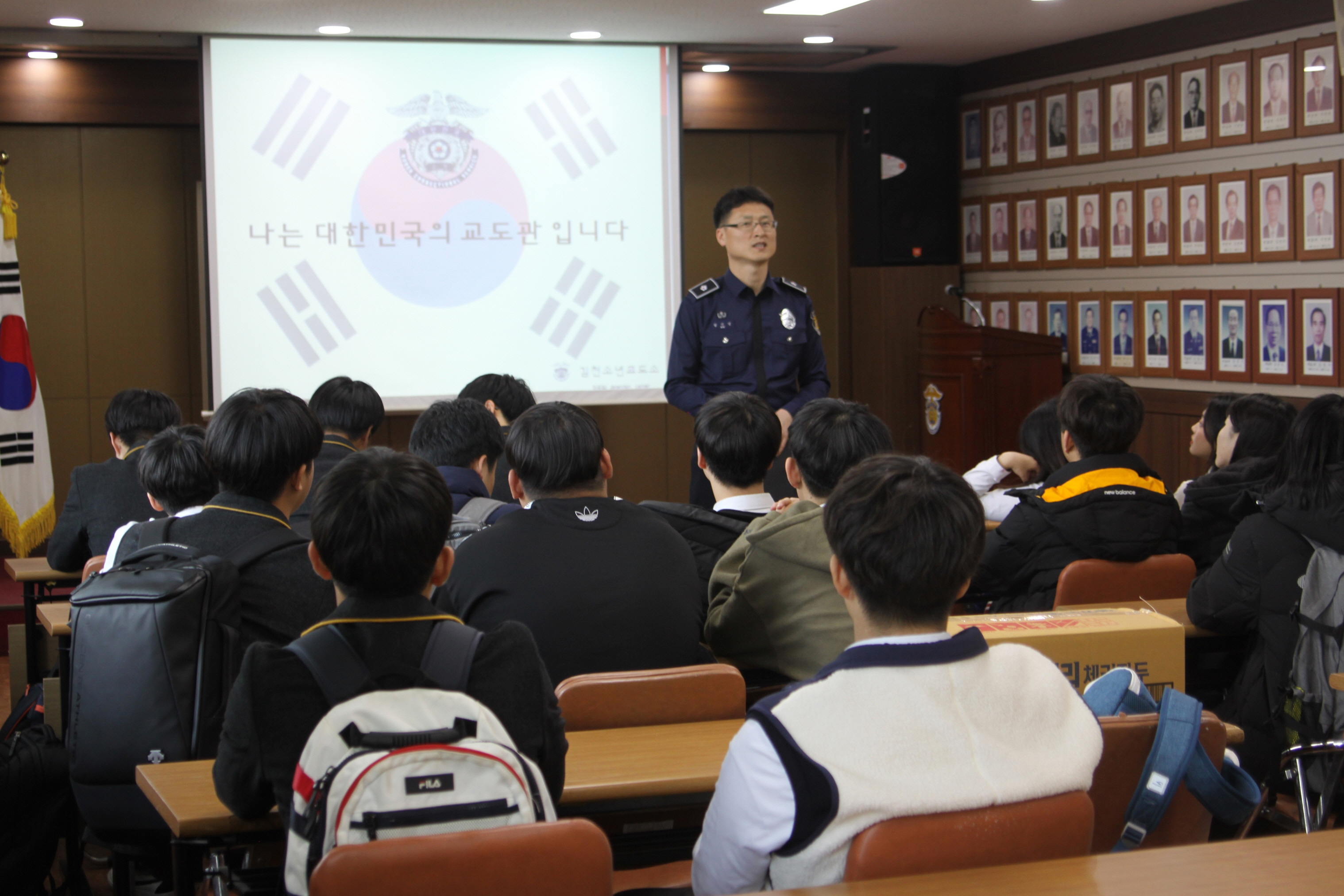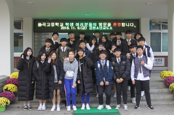 | 율곡고등학교(교장 남득술) 재학생 중 P.O.W(행정·정책 동아리)와 희망자 24명은 지난 11월 9일에 김천소년교도소(지좌동)를 방문하였다. 사전에 참관인 명부를 작성하고 교정시설을 견학하는 것에 꼭 필요한 절차들을 거친 후 지켜야 할 유의사항 등을 마음에 새기며 프로그램에 참여하였다. 이를 통해 평소 교도관에 대해 가지고 있던 여러 궁금증과 소년 범죄자들의 수용시설에 대한 호기심을 해결할 수 있는 기회를 가지게 되었다.