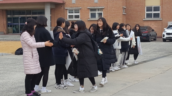 | 김천여자중학교(학교장 한원익)는 지난 11월 16일, 본교 전역에서 학교폭력 예방교육의 일환으로 ‘하이파이브데이’ 행사를 실시하였다. 이번 ‘하이파이브데이’행사는 상호 신뢰의 마음을 나누어 학교폭력을 예방하고, 안전한 학교공동체 문화를 조성하기 위해 진행되었다.
