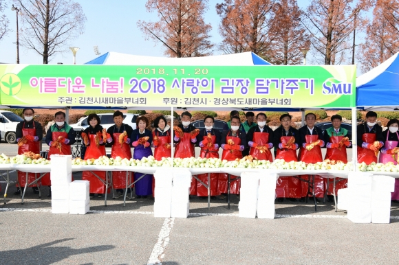 한편 김천시 새마을회는 사랑의 김장 담가주기 행사 뿐만 아니라 자원재활용품 수집, 감자심기, 대파심기, 강정만들기, 농약 빈병 수거 등을 통해 조성된 기금으로 불우이웃 돕기를 실천하여 시민 모두가 행복한 공동체 조성에 앞장서고 있다.
