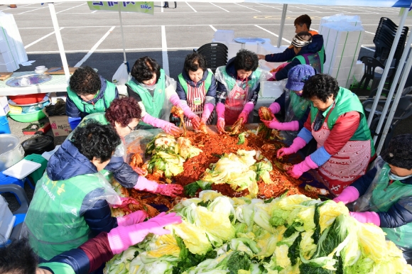 이날 김장 담아주기 행사를 위해 읍면동 새마을부녀회에서는 며칠 전부터 배추를 씻고 소금에 절이고 배추속을 마련하는 등 행사준비로 분주했다.