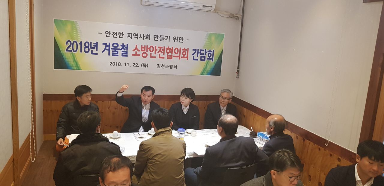 | 김천소방서(서장 이주원)는 22일 선채령(관내식당)에서 소방공무원 및 소방안전협의회원 등 20여명이 참석한 가운데 민․관 공조체제 유지 및 겨울철 소방안전대책 추진 활성화를 위해 소방안전협의회 간담회를 실시하였다.
