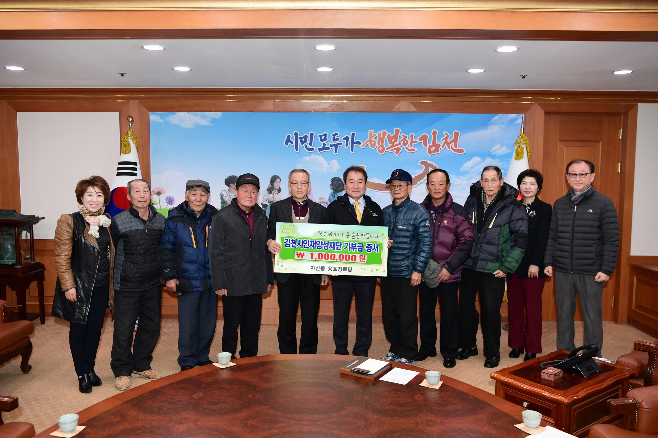 | 자산동 용호경로당(회장 유윤득)에서 지난 11월 26일 김천시청을 방문하여 김천시인재양성재단에 장학기금 일백만원을 기탁했다.