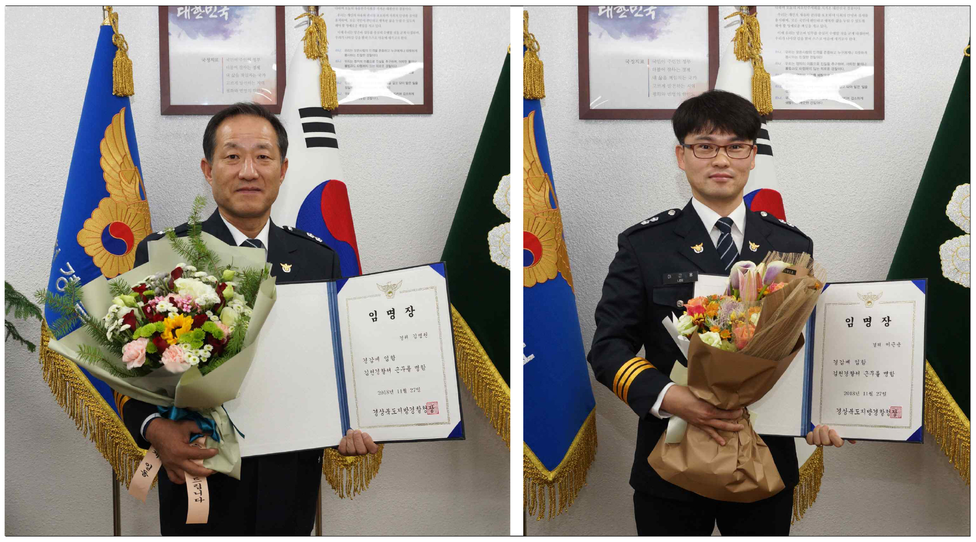 | 김천경찰서(서장 김우락)에서는 지난 11월 27일 오전9시 2층 서장실에서 교통조사팀장 김명원 경감, 경제수사팀장 이근용 경감에 대한 승진 임용식을 개최하였다.