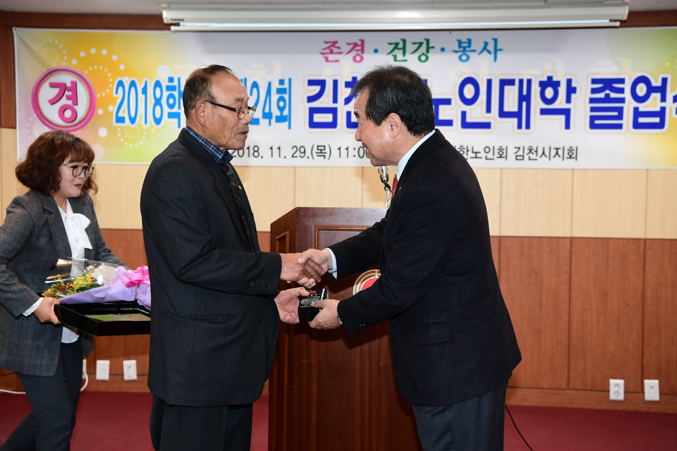 이날 졸업식에는 김영해 대한노인회 김천시지회장과 임석보 노인대학장 등 노인회지회 관계자와 김충섭 김천시장, 김세운 김천시의회의장을 비롯한 내빈이 참석하여 격려와 축하를 아끼지 않았다. 김충섭 김천시장은 “세상이 너무나 빨리 변하고 있어서 노인들도 끊임없이 배우지 않으면 일상생활 적응도 어렵다.”며 평생교육을 강조하고, “어르신 여러분은 평생을 가족을 위해 헌신하셨고, 나라가 어려울 때 열정과 희생을 다 바쳐 오늘을 있게 한 분들로 시에서 소홀함 없이 잘 모시겠다.”고 말했다.