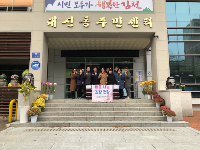 | 김천동신초등학교(교장 이형석)에서는 지난 12월 3일 오후 2시에 김천동신초등학교 교장, 학부모회장단과 함께 김천시 대신동주민센터를 찾아가 김천동신초등학교 학부모회에서 준비한 마음 나눔 김장을 전달하였다. 마음 나눔 김장은 김천동신초등학교 학부모회에서 대신동 관내 독거노인을 위해 준비한 올해의 마지막 학부모 학교 참여 지원 사업으로 12월 1일에 김장을 하였다. 이 김장 김치는 대신동에 거주하고 계시는 독거노인 20명에게 전달하기로 하였다. 안민 대신동장은 “이렇게 뜻깊은 김장 김치를 보내주셔서 고맙고 그 분들이 추운 겨울을 나는데 많은 도움이 될 것이다”라고 말하였다.