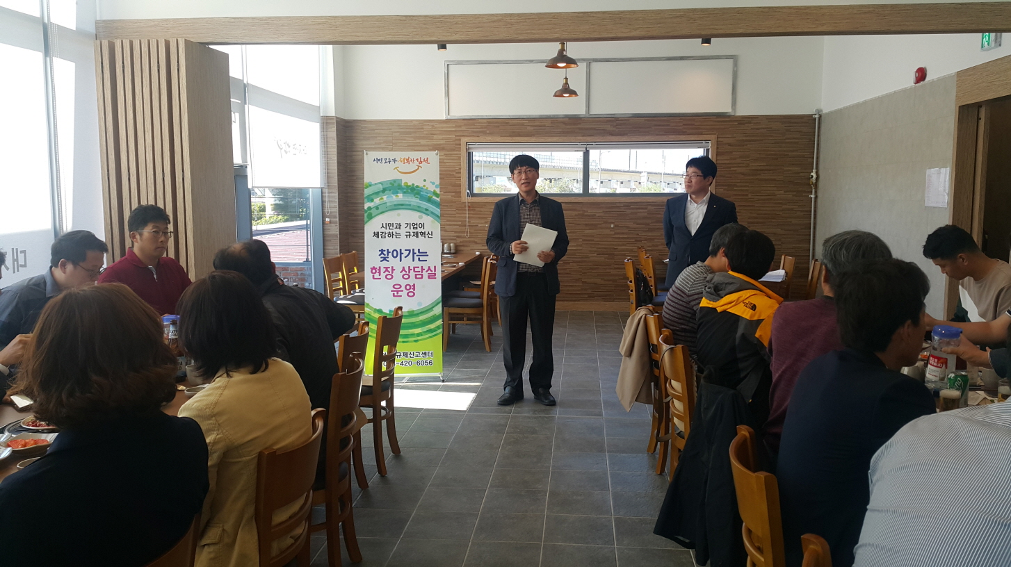 먼저 상공회의소 주관 기업체 실무자 간담회를 시작으로 김천시 건축사협회 간담회, 김천시 전문건설업 협회 회장 면담을 실시하였으며, 또한 김천코오롱 생명과학(주), (주)KCC 및 (주)두산전자 등 기업체를 방문하여 기업 활동에 따른 규제에 대해 홍보와 상담을 실시하였다.