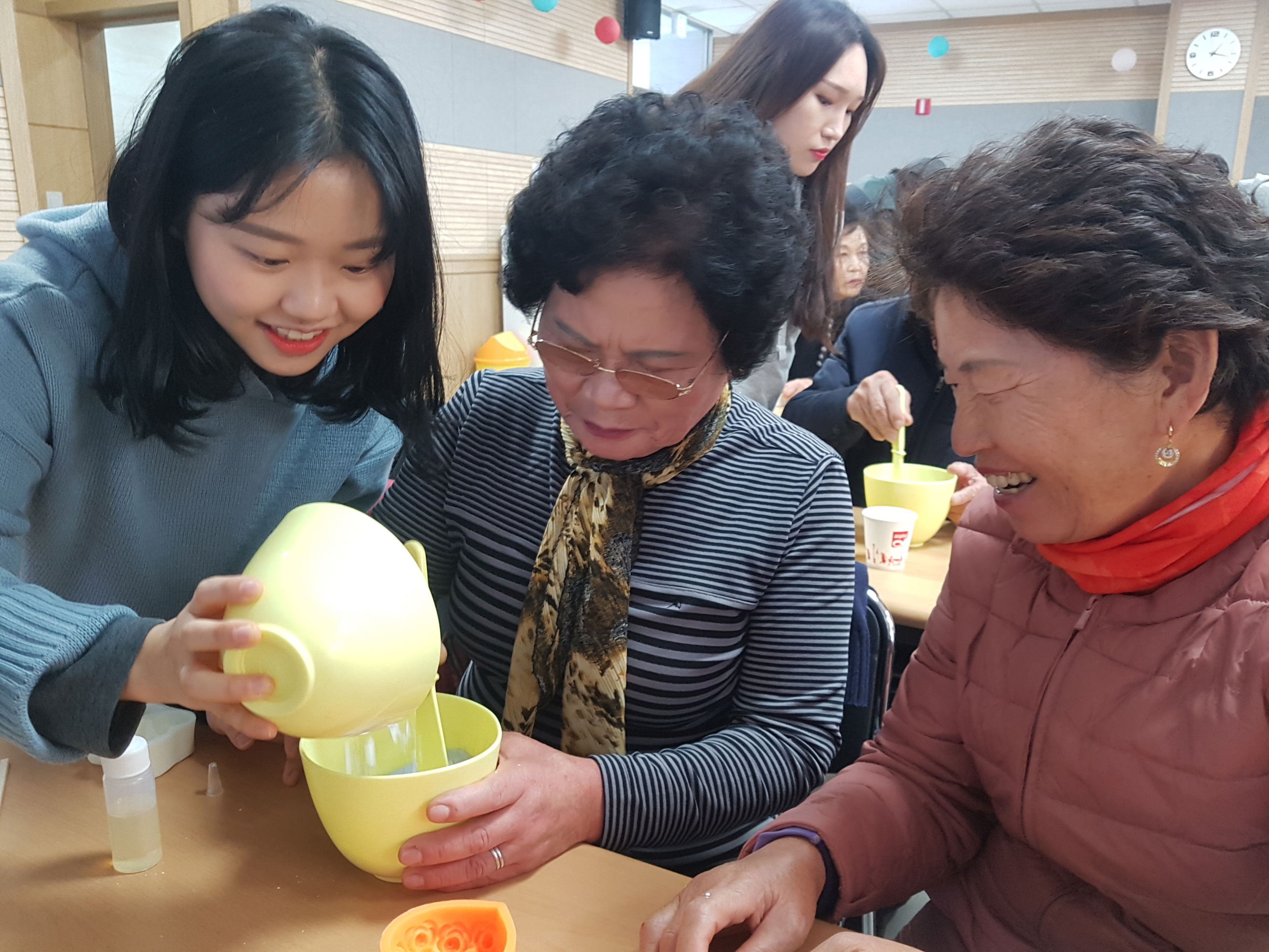 | 이날 교육은 김천관내 노인 30여명을 대상으로 ‘치매인식 개선교육’, ‘석고방향제 만들기’등 치매예방 교육을 실시하였으며, 본교 작업치료과 이두호 교수를 비롯한 학생봉사자 15명이 참석하여 어르신들의 큰 호응을 얻었다.
