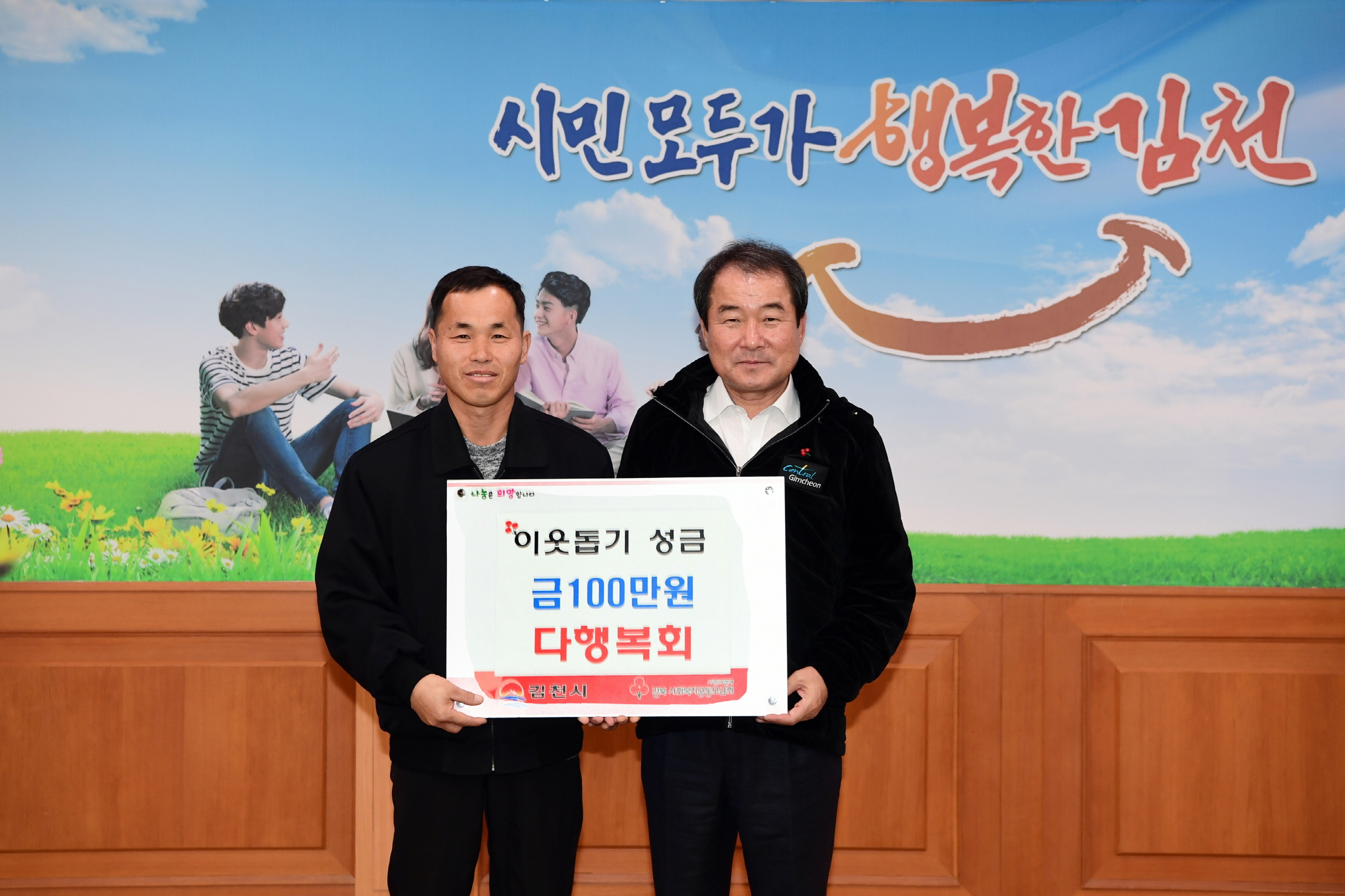 | 김천시 다문화가정 남편 자조모임 ‘다행복회’(회장 유영도)는 지난 6일 김천시청을 방문하여 희망2019 나눔캠페인 이웃돕기 성금 1백만원을 전달했다.