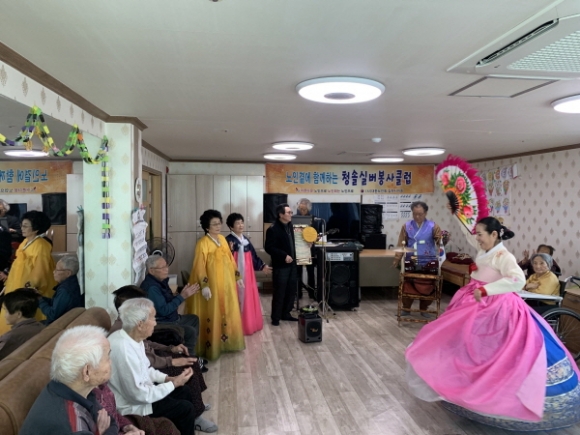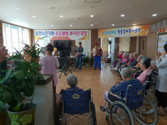 |  | | | ⓒ 김천내일신문 | | (사)대한노인회 김천시지회(회장 김영해)에서는 불편하신 몸을 치유키 위해 요양시설에서 외롭게 생활하고 계시는 어르신들에게 조금이나마 위안이 되고자 위문공연을 실시 하였다. 김천시 감천면과, 지좌동, 대신동에 위치한 요양시설을 지난 6월부터 방문하여 오늘까지 3개소를 방문공연을 하였고 12월에 3개소가 더 계획 중에 있다. 공연 팀은 대한노인회 김천시지회에서 발대식을 가지고, 어르신들로 구성이된 실버공연 팀이다. 이 팀을 명칭은“ 청솔실버봉사클럽” 으로 개개인의 특기와 재능을 살려 가요, 악기연주, 민요, 마술 등의 재능을 가진 어르신들이 함게 모여 팀을 이루었고, 봉사클럽으로서 위문공연 뿐만 아니라 노인들과 관련된 일들에 봉사를 하고 있는 공연 팀이다. 불편하신 몸으로 음악에 맞추어 춤을추고 노래를 따라부르고, 박수를 치며 보낸 시간들이 짧은 시간이지만 이것 역시 건강이 호전될 것 이라 생각하며, 앞으로도 요양원 뿐 만 아니라, 어르신들의 위안이 되는 곳이면 어디든 찾아가 활동을 펼칠 것 이라고 회원들은 말했다. 김영해 지회장은 이런 봉사활동이 사회 곳곳에 퍼져나가 외롭고 힘든 노년생활에 활력소가 되고, 아픈몸이 치유가 될 수 있도록 타 단체에서도 고려 해 볼 문제라고 생각하고, 이 행사를 매년 치를 수 있도록 협조해준 지자체에 감사하다고 전했다. |  | | | ⓒ 김천내일신문 | |