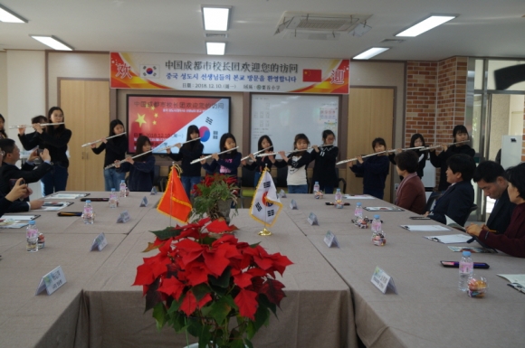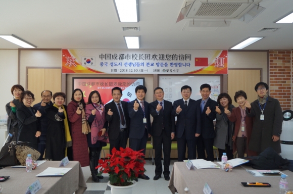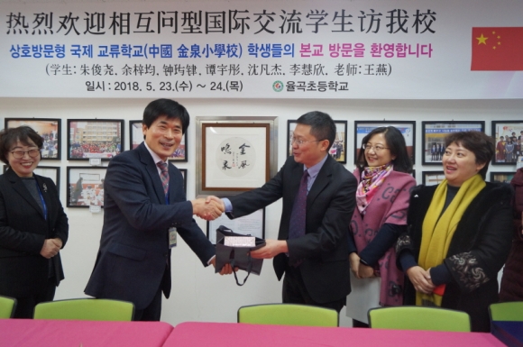 | 율곡초등학교(교장 이삼영)는 12월 10일 중국 성도시 교육국 교장, 교감단 방문 행사를 가졌다. 이번 방문은 중국 성도시 교육국과 김천교육지원청과의 자매결연을 통한 교육교류사업의 일환으로 현재 중국 성도시 금천소학교와 교류중인 본교의 교육내용 시찰을 통한 벤치마칭 방안 모색에 목적이 있었다. 방문인원은 중국 성도시 교육국 교장단 4명, 당서기 2명, 김천교육지원청 과장 1명, 장학사 1명, 통역 2명 총 9명이었다. 활동내용은 본교현황, 국제교류관련내용, 국제교류실 구축상황등을 홍보자료 파일로 설명하였으며, 국제교류사업 동영상을 관람하였다. 또한 교장선생님의 환영사와 중국대표의 답사가 있었고 기념촬영이 있었다. 환영회로 학생들의 플롯연주와, 학부모님들의 기타연주첨밀밀, 반달 등이 있었다.