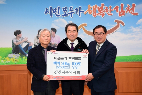 김충섭 김천시장은 “ 어려운 이웃들에게 도움의 손길을 늘 잊지 않고 보내주시는 수의사회에 감사의 말씀을 드리며, 덕분에 2018년 한해가 따뜻하게 마무리 될 것 같다. 2019년에도 지속적인 행복나눔실천을 통해 시민모두가 행복한 김천이 될 수 있도록 많은 도움을 부탁드린다”고 밝혔다.