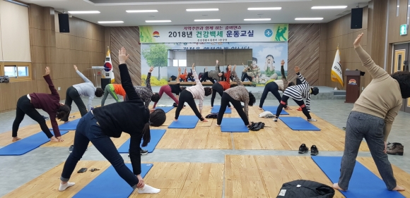 | 김천시보건소(소장 손태옥)에서는 김천시체육회와 연계하여 농사일로 뭉쳐있던 근육과 피로를 풀어줄 요가교실을 2019년 3월까지 4개월 과정으로 매주 월, 금 오전 11시에 봉산면 건강생활지원센터 3층 강당에서 운영한다.