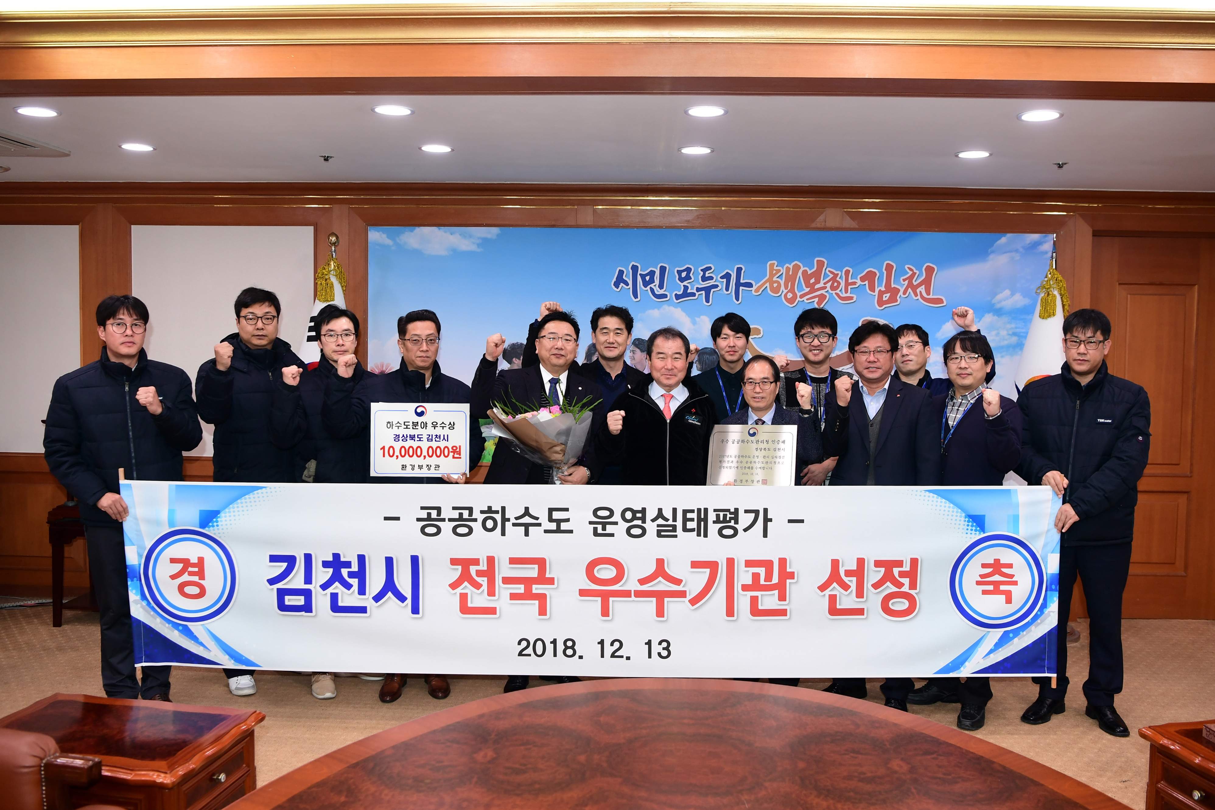 | 김천시(시장 김충섭)는 환경부에서 실시한 “2018년도 공공하수도 운영관리 실태평가”에서 전국 우수기관으로 선정돼 지난 12월 13일 환경부로부터 인증패와 시상금 1천만원을 수상하였다.