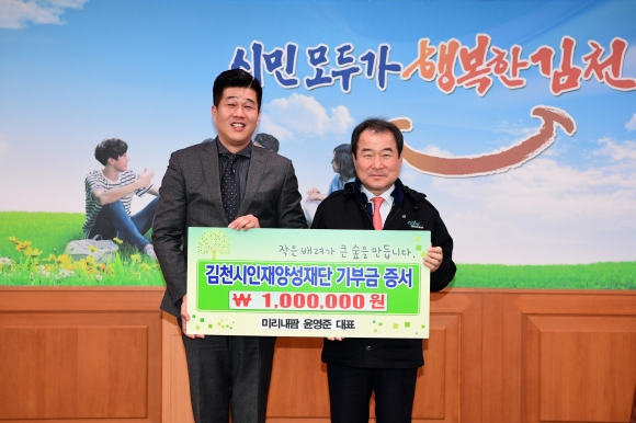 | 같은 날 미리내팜 윤영준 대표도 일백만원의 장학기금을 인재양성재단에 기탁했다. 윤영준 대표는 “지역에서 사업체를 운영하면서 지역사회에서 많은 도움을 받았다며 조금이나마 보답하기 위해 장학기금을 기탁한다” 며 소감을 전했다.