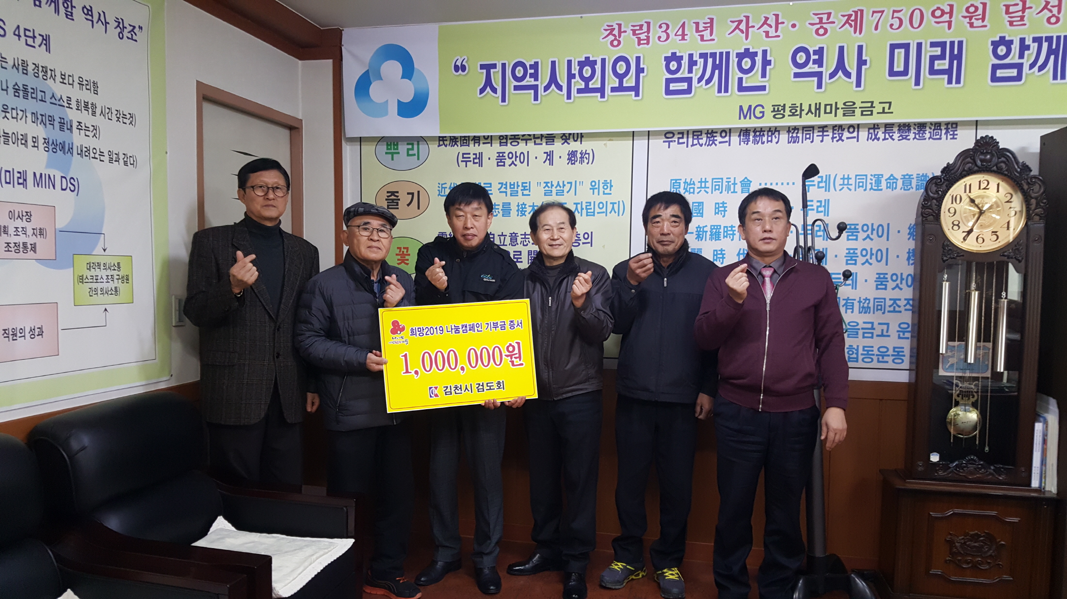 | 김천시 검도회(회장 이원선)에서는 2019희망나눔캠페인을 맞이하여 추운 겨울 열악한 환경에 어렵게 지내고 있을 소외계층에게 써달라며 1백만원 성금을 기탁하였다.