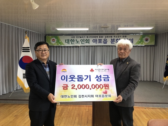 | 아포읍 노인회(회장 강선오)는 12월 18일 아포읍사무소에서 희망2019나눔캠페인 이웃돕기 성금으로 200만원을 전달했다.