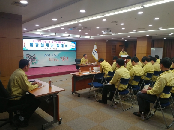 | 김천시(시장 김충섭)는 19일, 2층 회의실에서 내년에 시행할 각종 건설사업의 조기발주와 지역경제 활성화를 위한 “2019년 건설사업 조기발주 합동설계단” 발대식을 가졌다.