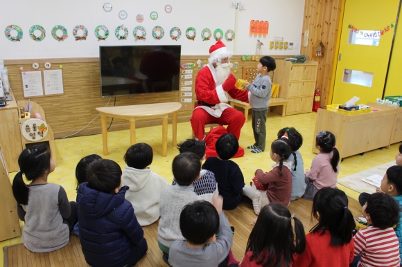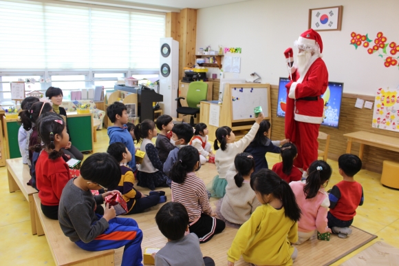 산타행사가 시작되기 전 각 교실에서 유아들과 크리스마스의 의미에 대해 알아보고, 산타할아버지 노래를 불러보며 흥미를 유발하였다. 산타할아버지가 교실에 선물 보따리를 들고 들어오는 순간 유아들은 무척 놀라고 신기해하며 환호성을 질렀다. 산타할아버지의 등장에 유아들은 궁금했던 질문들을 쏟아내며 즐거운 시간을 보냈다. “눈도 안 오는데 썰매타고 왔어요? 뭐 타고 왔어요?” “산타할아버지 우리 유치원으로 오는 길은 어떻게 알았어요?”라며 순수함을 가득 담은 질문들을 많이 하였다. 산타할아버지와 즐거운 이야기 시간이 끝이 나고, 산타할아버지는 모든 유아들의 이름과 따뜻한 편지말을 전하며 선물을 전달하였다. 유아들은 산타할아버지께 받은 선물을 보면서 기뻐하며 “집에 가서 엄마랑 함께 열어볼래요.”라고 말하며 설렘이 가득했다.
