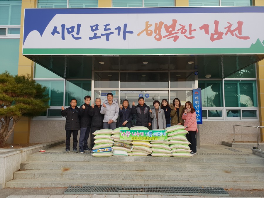 | 12월 26일 개령면 쌀전업농회(회장 하구철)에서는 관내 독거노인 및 어려운 이웃에게 전달해 달라며 직접 농사지은 백미 20㎏ 32포(150만원 상당)를 기탁하여 널리 귀감이 되고 있다. 하구철 개령면 쌀전업농회장은 “추운 연말연시에 나눔의 손길이 필요한 관내 어려운 이웃에게 회원들이 십시일반 모은 정성이 작으나마 보탬이 되었으면 좋겠다.”고 전했다.