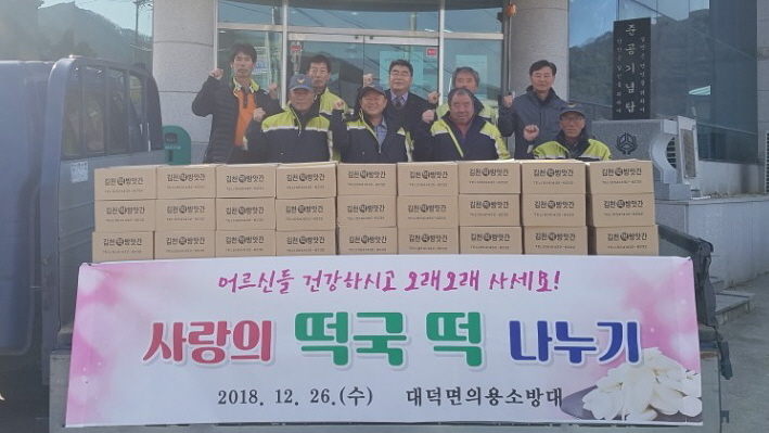 이번 떡국떡 나눔 행사는 농한기 마을 어르신들이 따뜻한 떡국을 나눠 먹을 수 있도록 대덕의용소방대원들이 직접 각 경로당을 방문해 어르신들의 안부를 묻고 준비해 간 떡국떡을 전달하는 훈훈한 나눔을 실천했다. 또한, 독거노인세대 등 어르신댁의 화재예방 홍보활동을 전개하였다.