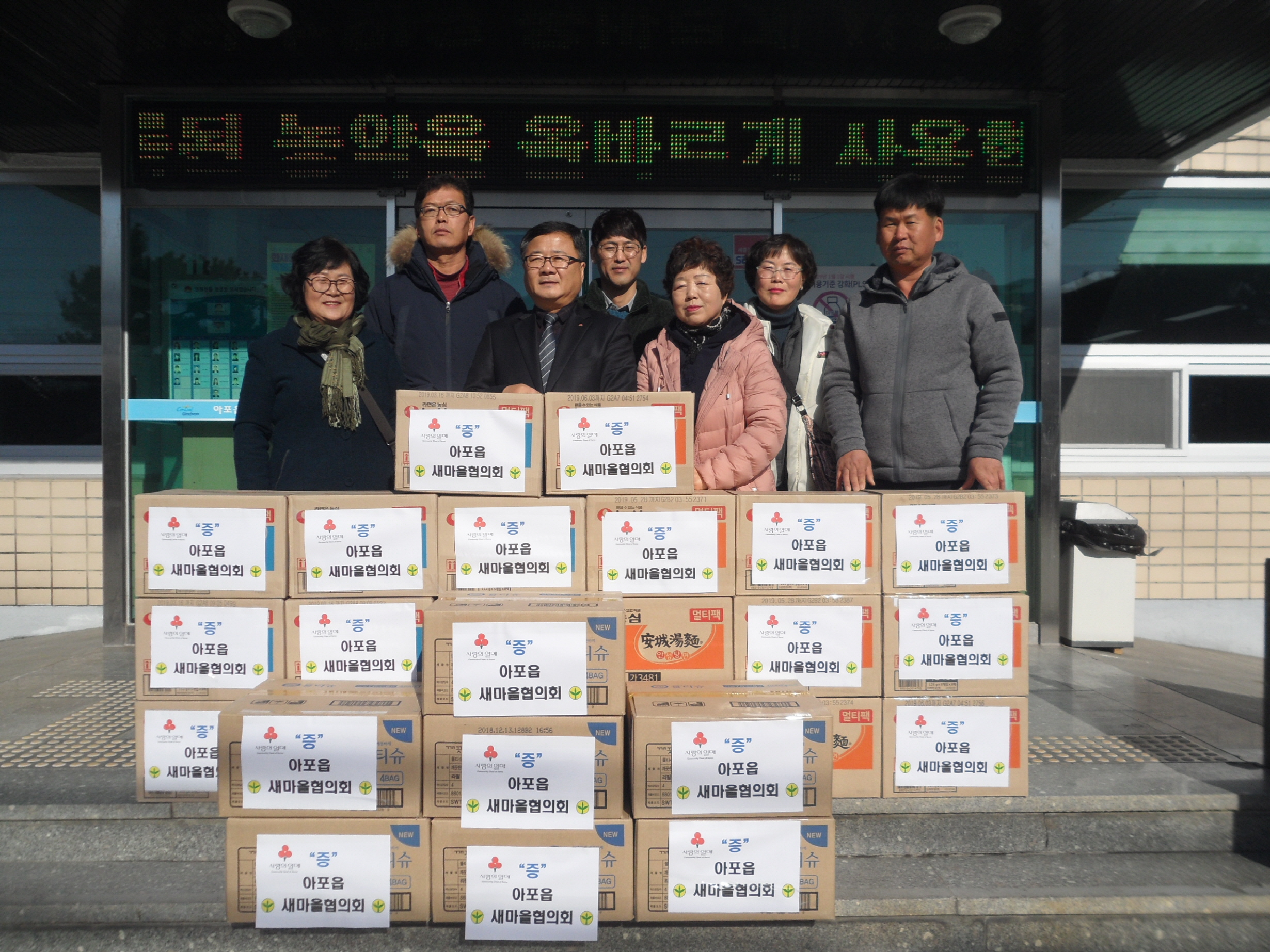 | 아포읍 새마을 남·여 협의회(협의회장·박용복, 부녀회장·권경애)와 아포읍행정복지센터에서는 2018년의 마지막 날인 12월 31일 오전 읍사무소 전정에서 최근 관심과 사랑이 식어가는 어려운 이웃들에게 사랑의 손길을 내밀며 겨울을 따뜻하게 생활할 수 있도록 이들에게 물품 전달식을 가졌다.