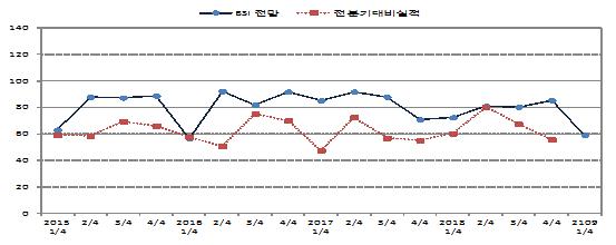 2019년 1/4분기 기업경기전망지수가 2018년 4/4분기보다 큰 폭으로 하락한 수치를 보여 우리 기업들이 느끼는 체감경기가 여전히 나빠질 것이라는 전망을 나타내고 있다.