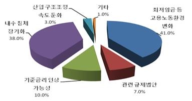2019년 경영에 큰 영향을 줄 수 있는 대내리스크를 묻는 물음에는 ‘최저임금 등 고용노동환경 변화’(41.0%)를 가장 많이 꼽았으며, ‘내수 침체 장기화’(38.0%), ‘기준금리 인상 가능성’(10.0%), ‘관련 규제법안’(7.0%), ‘산업 구조조정 속도 둔화’(3.0%) 순으로 나타났다. <‘기타’(1.0%)>