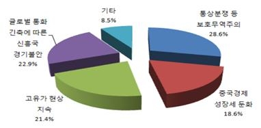 또한 2019년 경영에 큰 영향을 줄 수 있는 대외리스크에 대한 질문에는 ‘통상분쟁 등 보호무역주의’(28.6%)를 가장 많이 답했으며, ‘글로벌 통화 긴축에 따른 신흥국 경기불안’(22.9%), ‘고유가 현상 지속’(21.4%), ‘중국경제 성장세 둔화’(18.6%) 순으로 나타났다. <‘기타’(8.5%)>