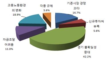 내년도 사업(투자)계획의 방향에 대한 질문에는 ‘보수적’(86.9%)이라고 답한 업체가 ‘공격적’(13.1%)이라고 답한 업체보다 많았으며, 그 이유로는 ‘경기 불확실성 증대’(42.2%), ‘고용노동환경의 변화’(18.9%), ‘기존시장 경쟁 과다’(16.7%), ‘자금 조달 어려움’(11.0%), ‘신규 투자처 부족’(5.6%), ‘각종 규제’(5.6%) 순으로 조사됐다.