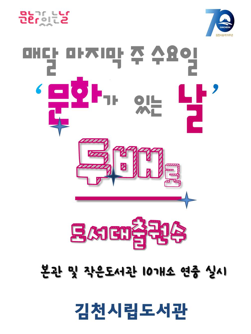 이번 이벤트는 문화체육관광부에서 추진하는‘문화가 있는 날’행사에 시립도서관이 참여하는 형식으로, 김천시민들의 풍요로운 독서활동을 위해 마련하였다. ‘도서대출 두배로’는 매월 마지막 주 수요일, 본관 오전 9시부터 오후 8시까지, 드림밸리 작은도서관 오전 10시부터, 그 외 작은도서관 9개소는 오후 1시부터 6시까지 이용가능하다.