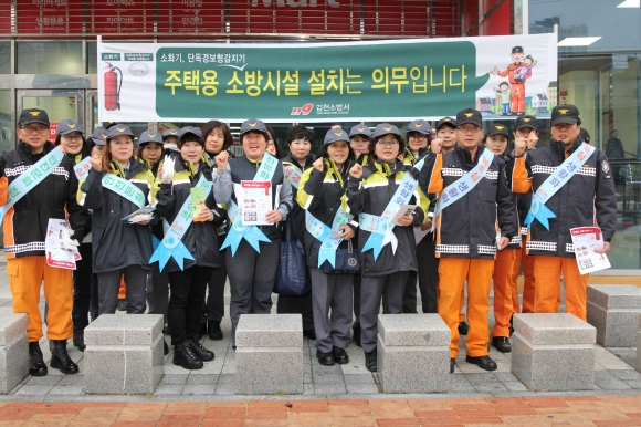 | 김천소방서(서장 이주원)는 15일 오후4시 신음동 대형마트 일원에서 소방공무원 및 대광여성의용소방대원 40여명이 참여한 가운데 겨울철 화재예방 및 주택용 소방시설 의무설치 촉진을 위한 캠페인을 실시하였다.