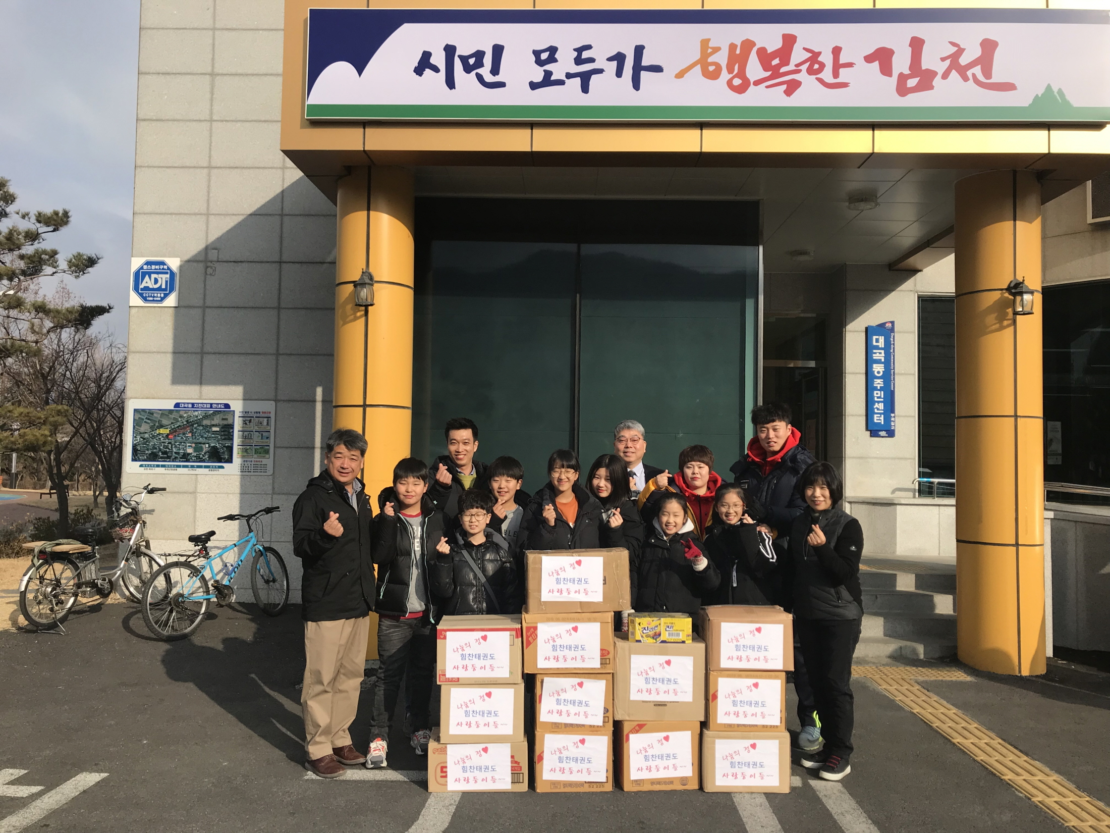 | 17일 김천시 대곡동 소재 힘찬태권도학원 원생 10여명은 추운겨울 어려운 이웃에게 작은 사랑으로 모은 라면 13박스를 어려운 이웃들에게 전달하여 달라며 대곡동주민센터에 전달하였다.