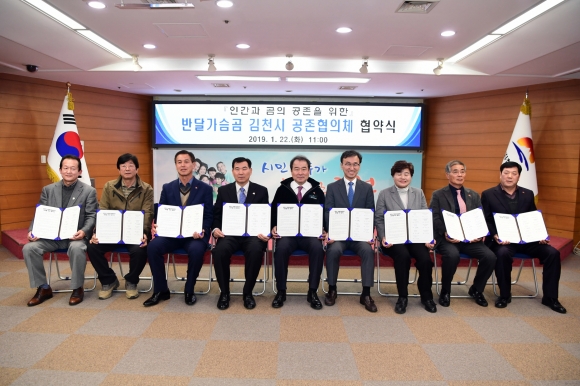 | 김천시(시장 김충섭)는 지난 22일 김천시청 2층 회의실에서 8개 관계기관 및 단체가 참여한 가운데 「반달가슴곰 김천시 공존협의체」를 구성하고 업무협약을 체결했다.