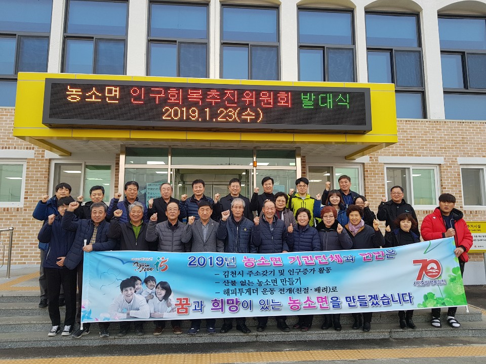 | 김천시 농소면(면장 이정하)은 지난 23일 농소면 18개 단체회장으로 구성된 농소면 인구회복추진위원회(위원장 안종복)의 발대식을 개최하고 15만 인구회복 및 김천愛주소갖기 운동 적극동참을 다짐했다.