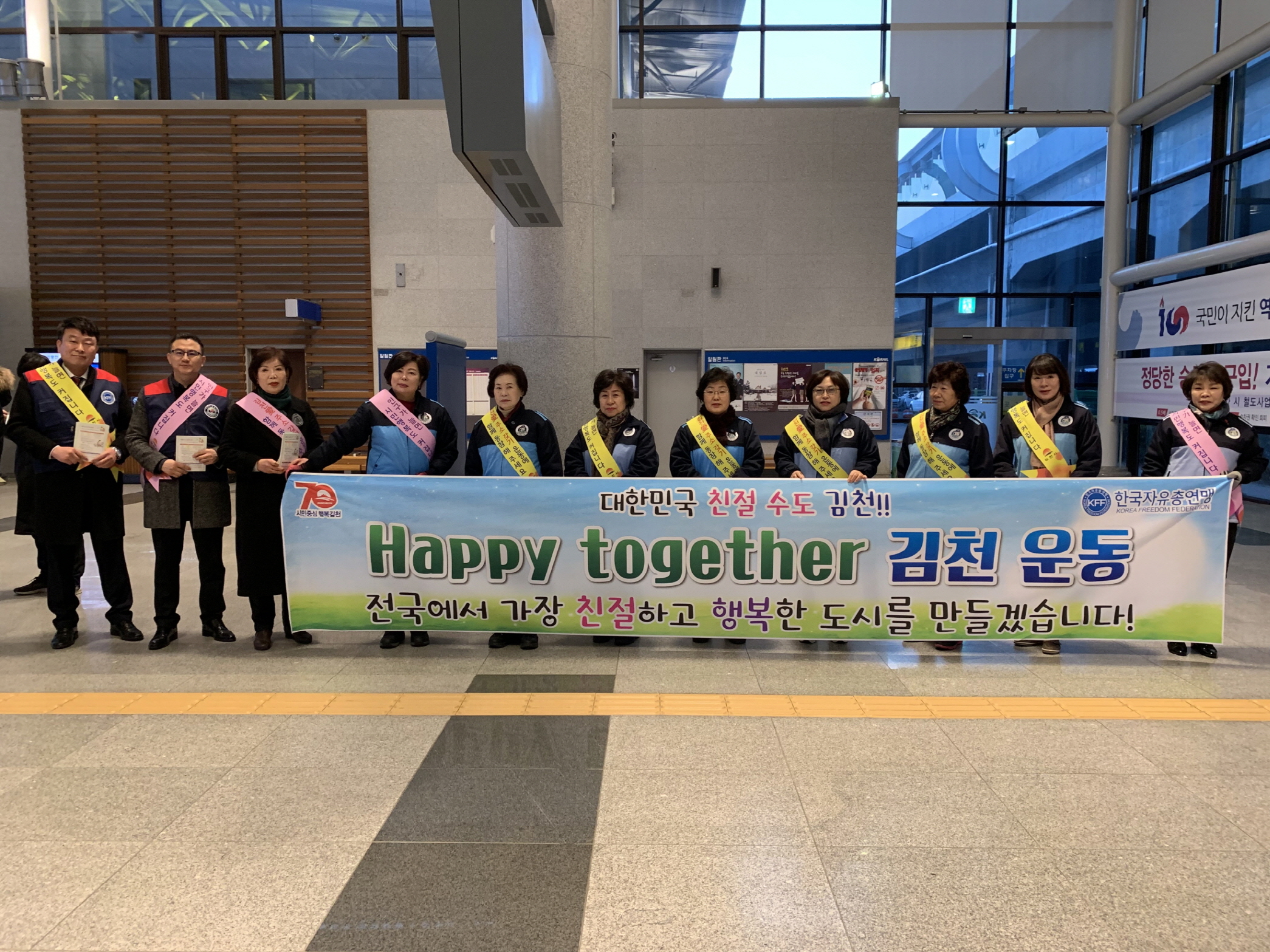 | “전국에서 가장 친절하고 행복한 도시를 만들겠습니다.” 한국자유총연맹(이하 자총) 김천시지회 회원과 김천시청 기획예산실 직원들이 25일 오전 8시 KTX김천(구미)역에서 Happy together 김천 운동 확산을 위한 합동 캠페인을 전개했다.
