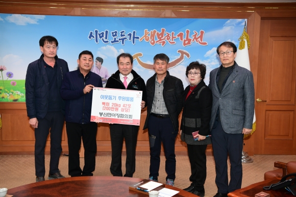 | 김천시 봉산면이장협의회(회장 박희중)는 설명절을 앞두고 생활이 어려운 저소득층에게 전달해 달라며, 백미 20kg 42포(시가 200만원 상당)를 김천시에 기탁하였다.