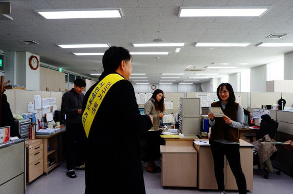 이날 문화관광과 직원들은 우정조달센터 김대수 주무관의 안내로 각 과별로 담당 직원을 배치하여 홍보전단과 실과소 직원들과의 일대일 대화를 통하여 시민모두가 행복한 김천을 만들기 위해서는 공공기관 임직원들의 전입해야 된다는 당위성을 설명하여 우정사업조달센터직원들로부터 환영을 받았다. |