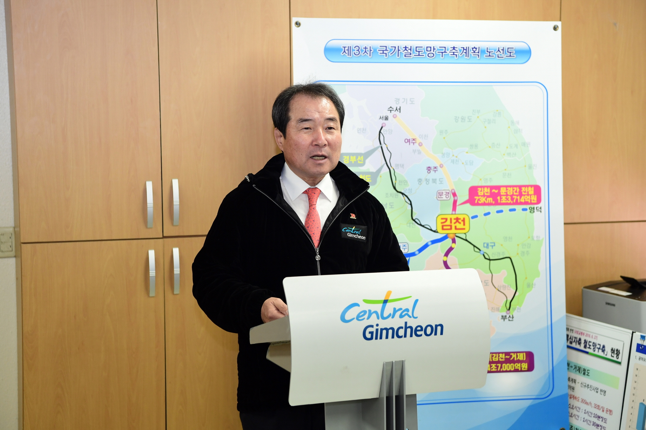 | 이에 김천시는 노선 확정을 위해 정부를 비롯한 관련 연구기관 및 학계를 수없이 방문·건의했으며, 철도가 통과하는 9개 시군과 행정협의체를 구성, 남부내륙철도 조기 착수를 위한 지자체간 결속을 주도하는 등의 노력을 더하였고 민선7기 출범이후에도 공약사업 선정 시부터 남부내륙철도 조기 착공이 김천 발전을 위한 필수 요건이라 판단하고 최우선 과제로 선정하여 추진에 속도를 더했다.