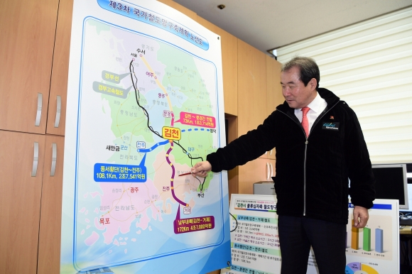 | 김천시(시장 김충섭)는 지난 1966년 기공식 이후에 중단된 남부내륙철도(당시“김삼선”)가 정부의‘2019 국가균형발전 프로젝트’에 포함, 1월 29일 국무회의의 의결로 예비타당성 면제 사업으로 확정되어 조기에 사업 착수가 가능할 것이라고 밝히며 대 시민 담화문을 발표하였다.