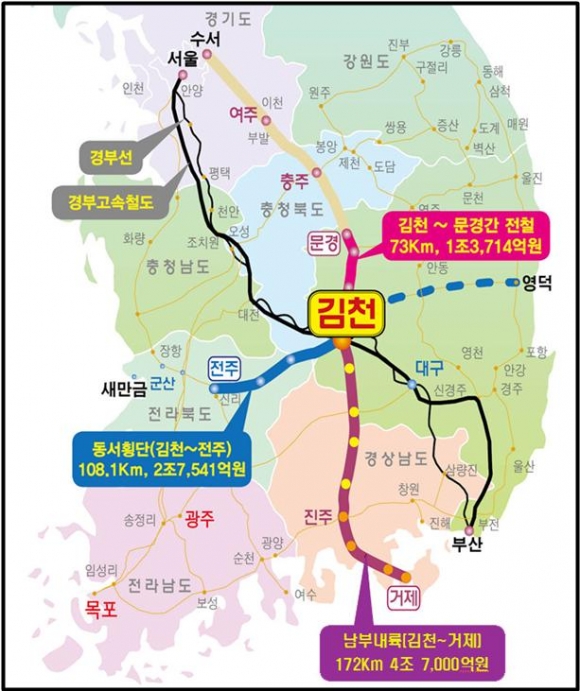 경북 김천시와 경남 거제시를 연결하는 남부내륙철도는 김천에서, 성주, 고령, 합천, 의령, 진주, 고성, 통영, 거제에 이르는 총 172㎞의 연장에 4조7천억원의 사업비가 국비로 투입되어 2025년 완공을 목표로 추진 중이며 당장 금년도에 기본설계를 실시할 전망이다.