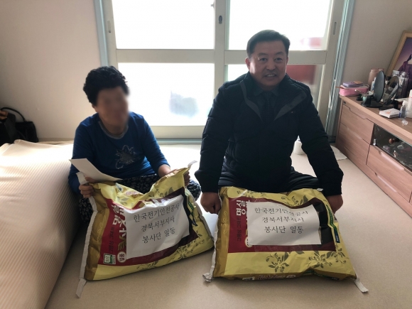| 한국전기안전공사 경부서부지사 봉사단(지사장 천문갑)은 29일 설 명절을 맞이하여 조손장애인 2가정을 찾아 40만원 상당의 쌀과 후원금을 전달했다.