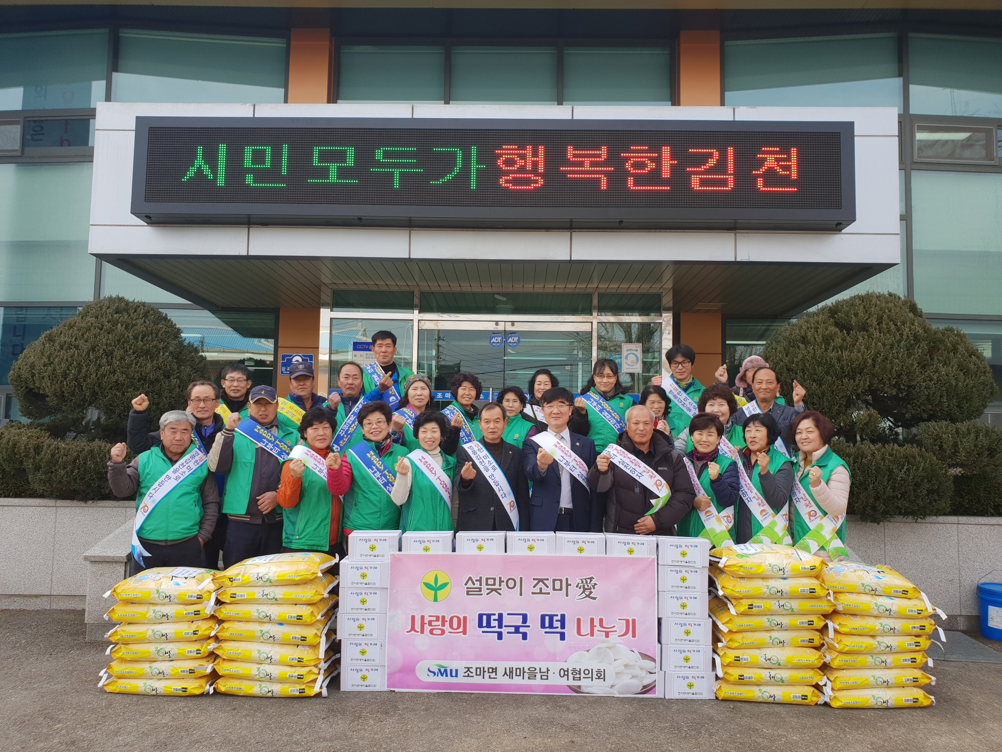 설맞이 사랑의 떡국 떡 나누기 행사는 조마면 남·녀 새마을협의회에서 합동으로 개최하였으며, 회원 30여명이 참석하여 가래떡 60박스를 관내 28개소 경로당 및 어려운 이웃에게 나누어 주었다. 조마면 새마을협의회는 항상 지역과 주민을 위해 앞장서는 솔선수범의 자세를 몸소 보여줬다. 이번 행사는 따뜻한 정을 나누는 행사로서 조마면을 행복한 공동체로 만들어 가는 데 새마을협의회가 앞장서기 위해 이루어졌다.