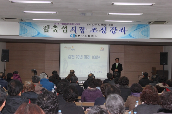 | 김천상공회의소(회장 김정호)는 지난 31일 오후 6시 30분 본 회의소 4층 대회의실에서 김충섭 김천시장을 초청해 「김천 70년 미래 100년」을 주제로 올해 첫 과정을 열었다.