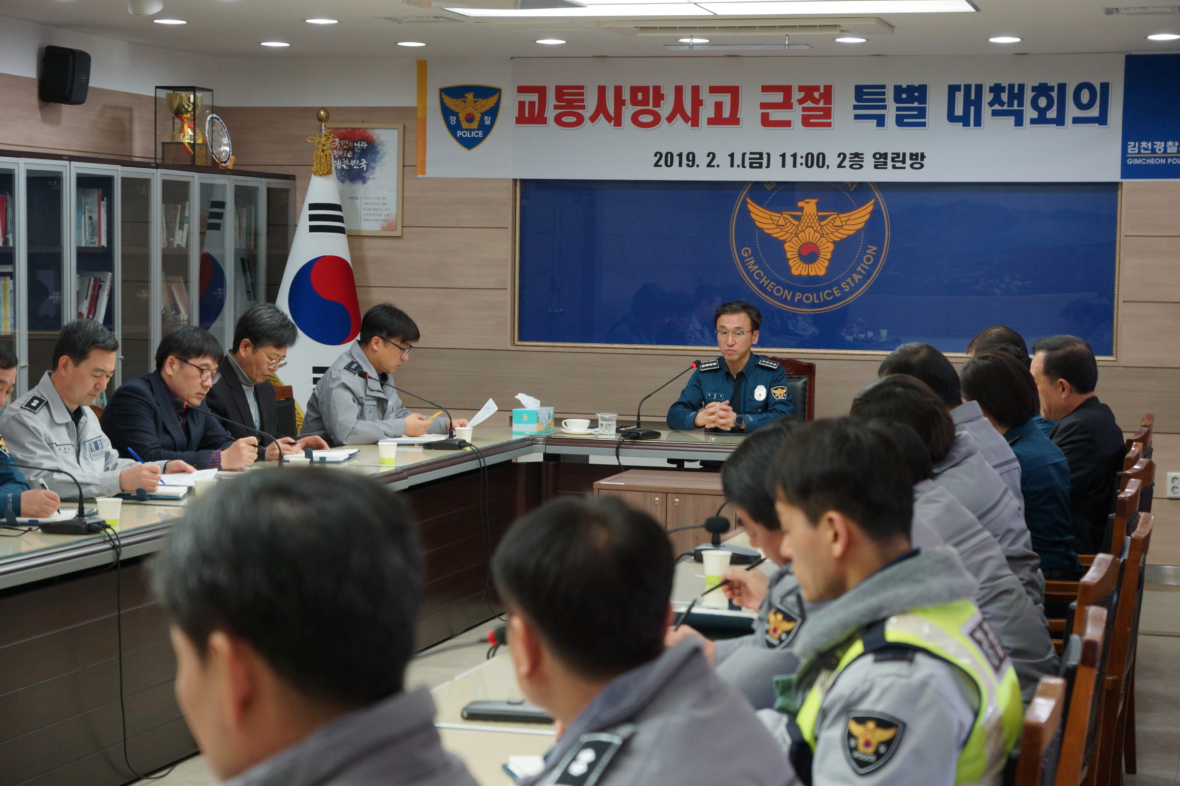 | 김천경찰서(서장 임경우)에서는 최근 증가하고 있는 교통사망사고 근절을 위해 2월 1일 오전 11시 김천경찰서 2층 소회의실에서 경찰서장, 파출소장 등 총 25명이 참석한 가운데 교통사망사고 근절 특별대책 회의를 개최하였다.