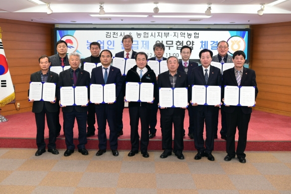 지난해 9월 조례제정 후 농업인 월급제 시행을 위하여 김천시 & 지역농협간 업무협약을 체결했다. 이날 업무협약식에는 김충섭 김천시장을 비롯한 서동완 농협김천시지부장, 이정복 지역농협조합장운영협의회장을 비롯한 지역농협장 전원이 참여하여 사업의 원활한 추진을 위한 업무협약을 체결했다.