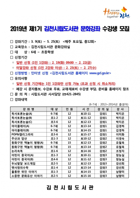 | 김천시립도서관(관장 신동균)에서는 2월 19일부터 27(수)까지 9일간 2019년 제1기 어린이 문화강좌 수강생을 모집한다.