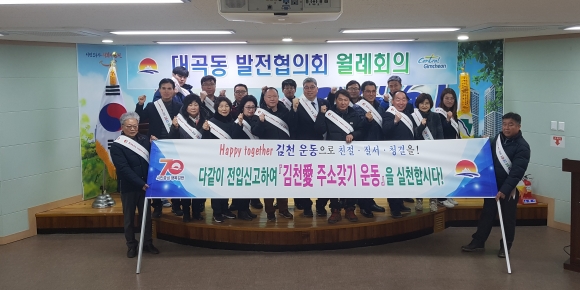 | 대곡동에서는 시 역점 시책 인 Happy together 김천운동과 김천愛 주소갖기 운동을 연계하여 가시적 성과를 내는데 주력하고 있다. 지난 13일(수) 저녁 7시 경, 대곡동 주민센터 2층에서는 대곡동 발전협의회의『Happy together 김천 운동』선포․결의문 낭독이 있었다.