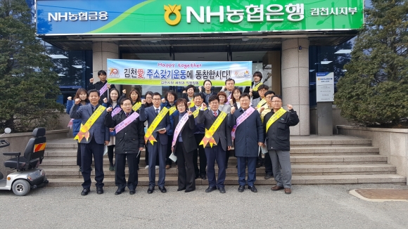 | 김천시 세정과에서는 15일 NH농협은행 김천시지부 및 대구은행 김천지점을 방문하여 김천愛 주소갖기 운동과 Happy Together 김천 운동홍보캠페인을 전개했다.