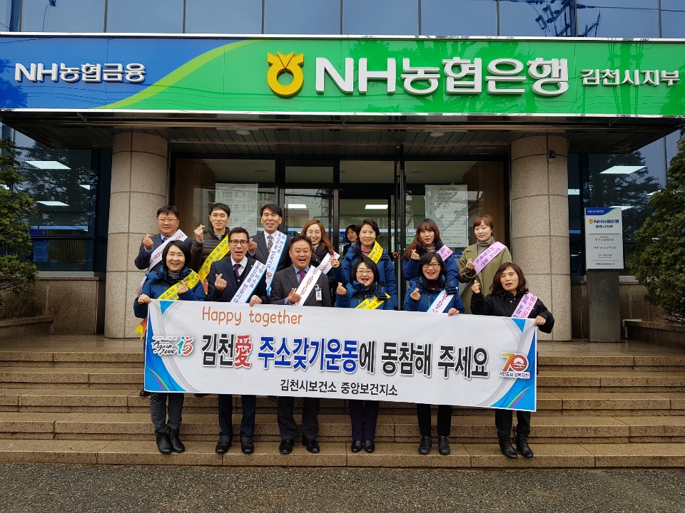 | 김천시보건소(소장 손태옥)와 농협은행 김천시지부(부지부장 이병주)는 지난 19일 오후 2시 농협은행 김천시지부에서「김천愛 주소갖기운동」및「Happy together김천 운동」캠페인을 실시하였다.